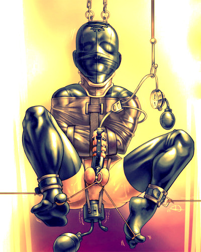 - At Home – Naked, apart from rubber shorts with a detachable front pouch and a rear zip. The front pouch was normally removed so its chastity cage/cock and balls were on display and the rear zip down. The pouch was attached and rear zip up only when it could be seen from the street. A pair of shiny black shorts and a shiny black t-shirt were provided should it need to answer the door.